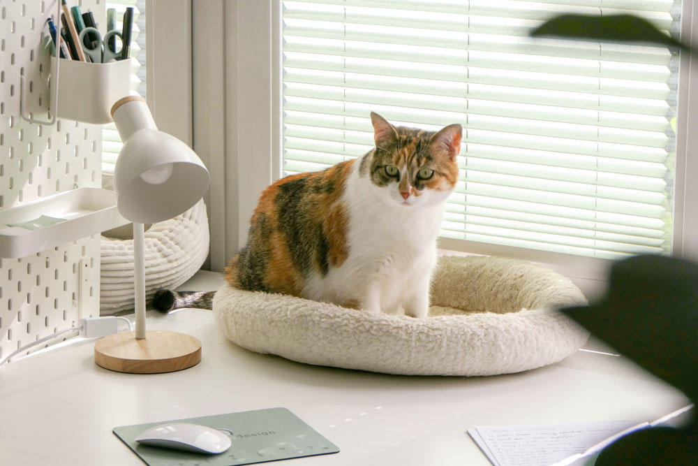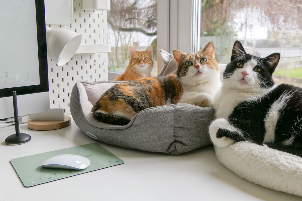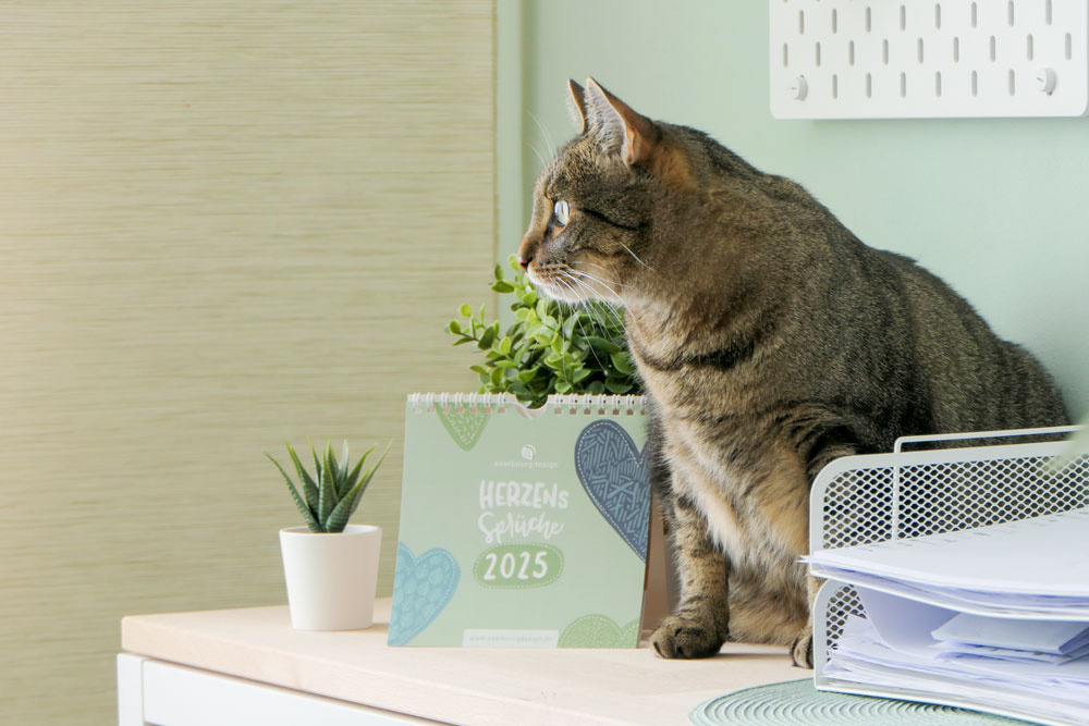 Auch unsere Katzen gehören ganz selbstverständlich zum Arbeitsalltag dazu: Ihre ruhige Präsenz im Büro sorgt oft für Entschleunigung und eine angenehme Atmosphäre, gerade an intensiven Arbeitstagen.